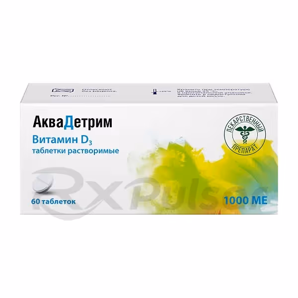 Akvadetrim is a pharmaceutical-grade supplement providing vitamin D3 (cholecalciferol). Each soluble tablet contains 1000 International Units (IU) of vitamin D3, a crucial nutrient for maintaining calcium balance and bone health. This formulation is designed for easy dissolution in water, facilitating optimal absorption by the body. The product is typically available in packages containing 60 tablets, providing a sufficient supply for several weeks of use, depending on the prescribed dosage.