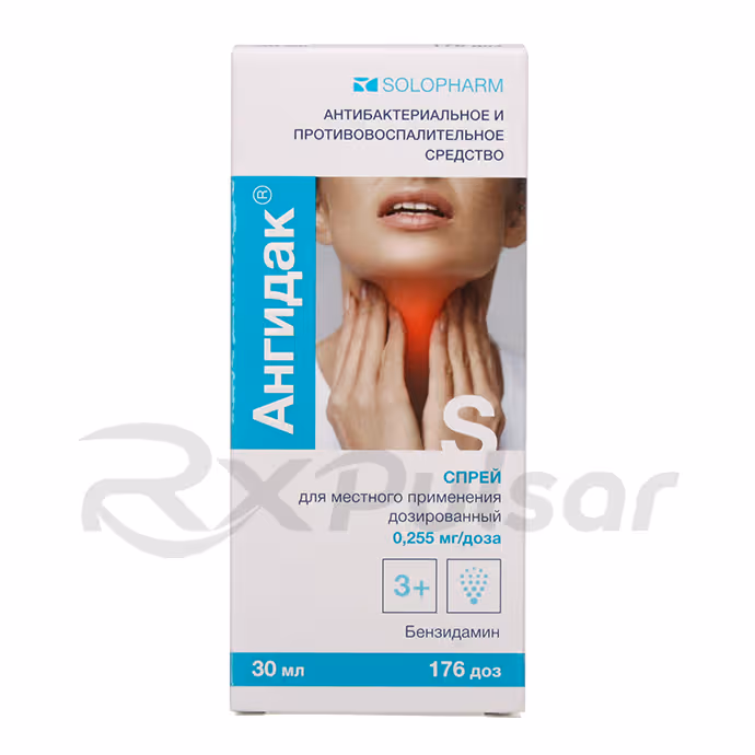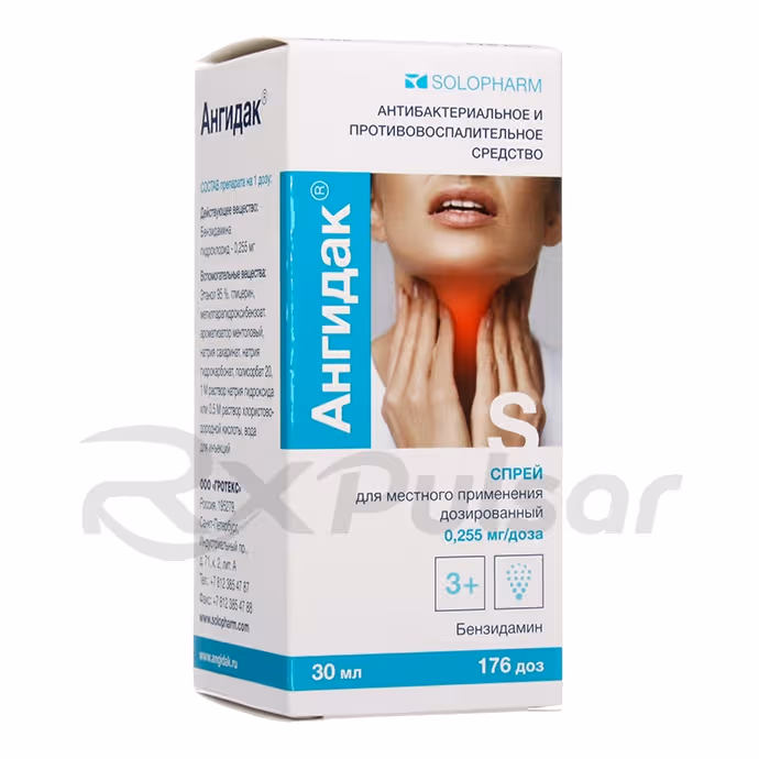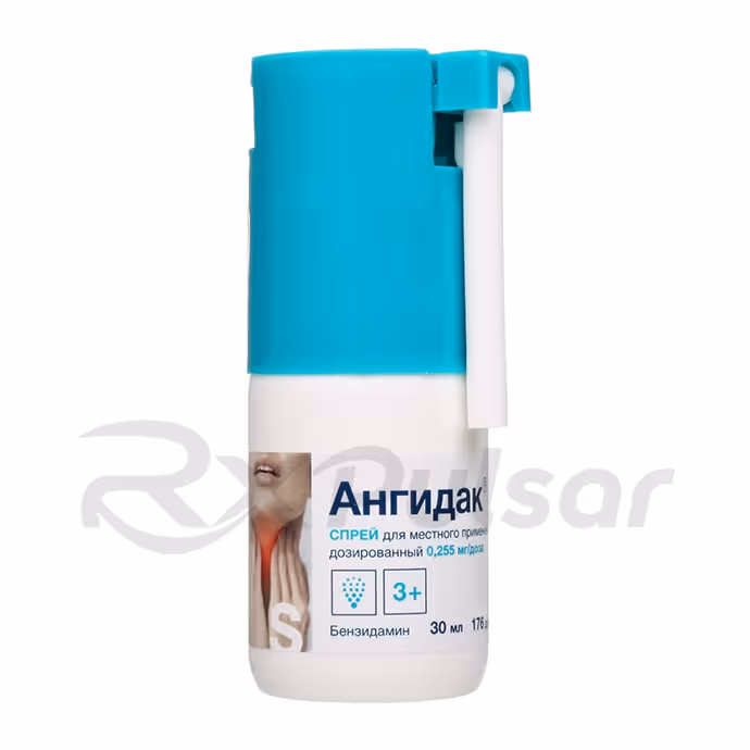 Angidak is a metered-dose spray containing benzydamine hydrochloride, a non-steroidal anti-inflammatory drug (NSAID). It’s formulated for topical application to the throat to alleviate pain and inflammation.