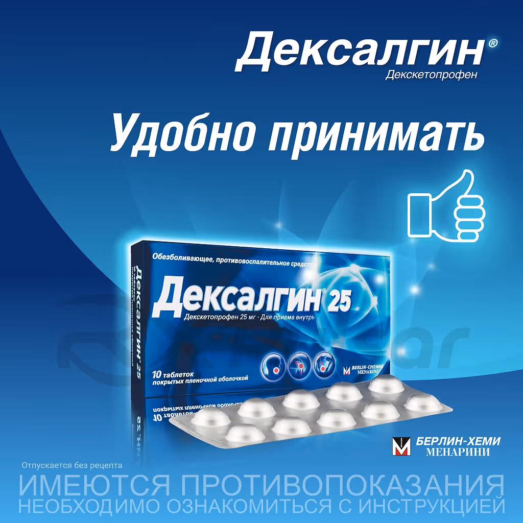 Dexalgin 25 contains dexketoprofen trometamol, a potent pain reliever. It’s designed for the symptomatic treatment of mild to moderate pain, providing effective relief when needed. The medication works by inhibiting the production of prostaglandins, substances responsible for pain and inflammation.