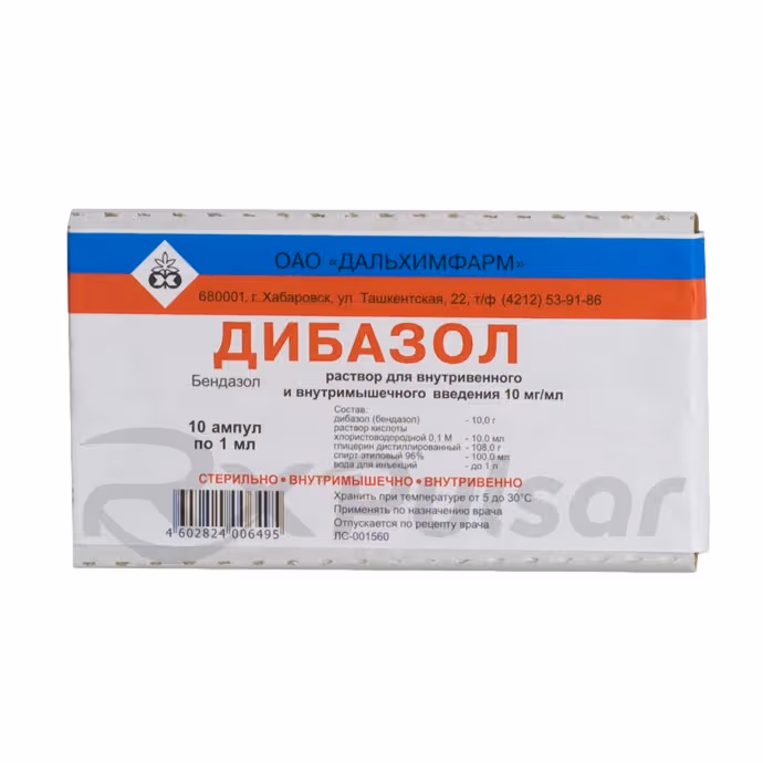 DIBAZOL injection solution is primarily composed of bendazole hydrochloride, the active pharmaceutical ingredient responsible for its vasodilatory effects. Each milliliter of solution contains 10mg of bendazole hydrochloride. In addition to the active component, the solution includes several excipients such as purified water, ethanol, and glycerol, which aid in the stability and delivery of the medication.