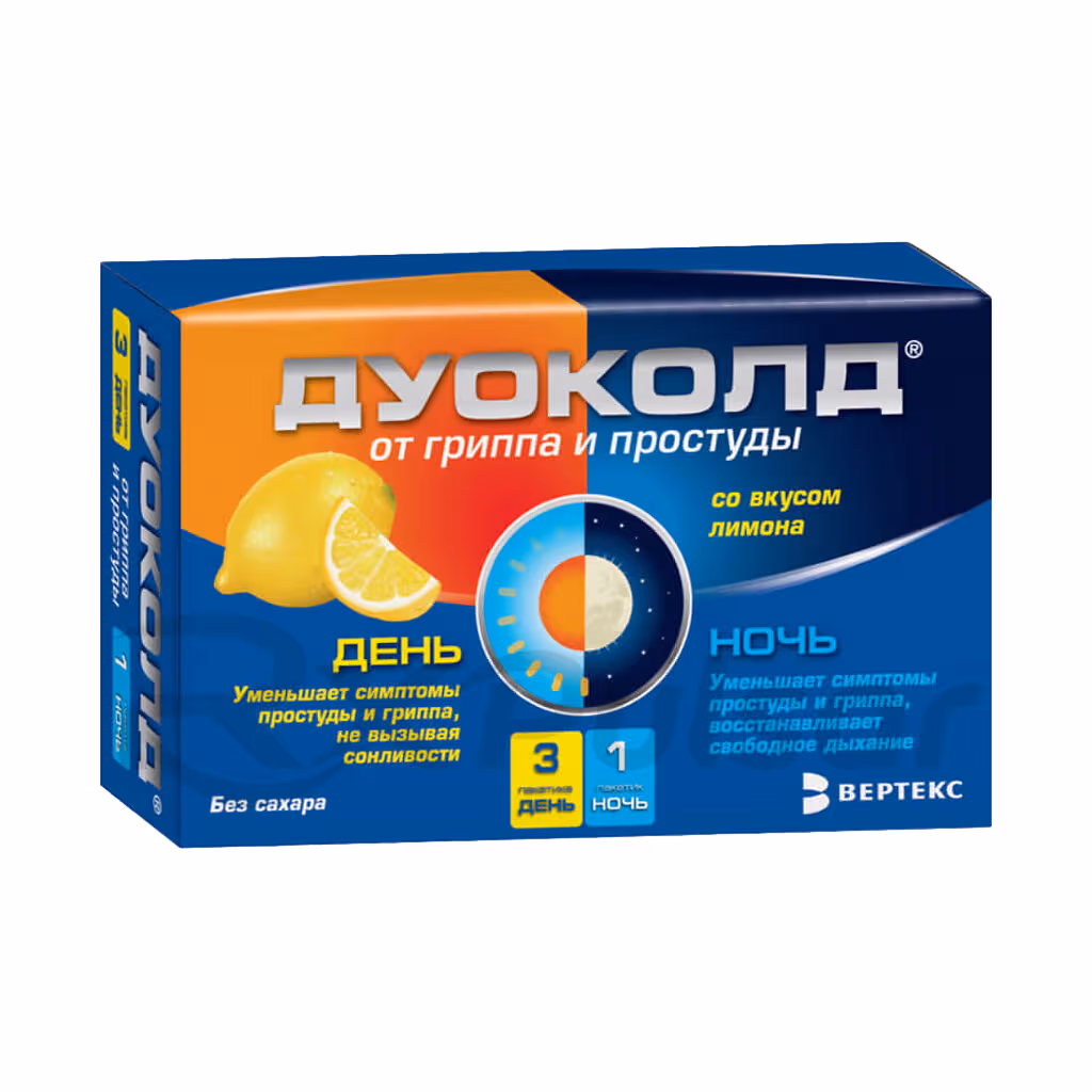 DUOCOLD powder for oral solution provides effective relief from the common cold and flu. Its convenient formulation makes it easy to manage symptoms quickly and efficiently. The pleasant lemon flavor makes it easier to consume, even when feeling unwell.