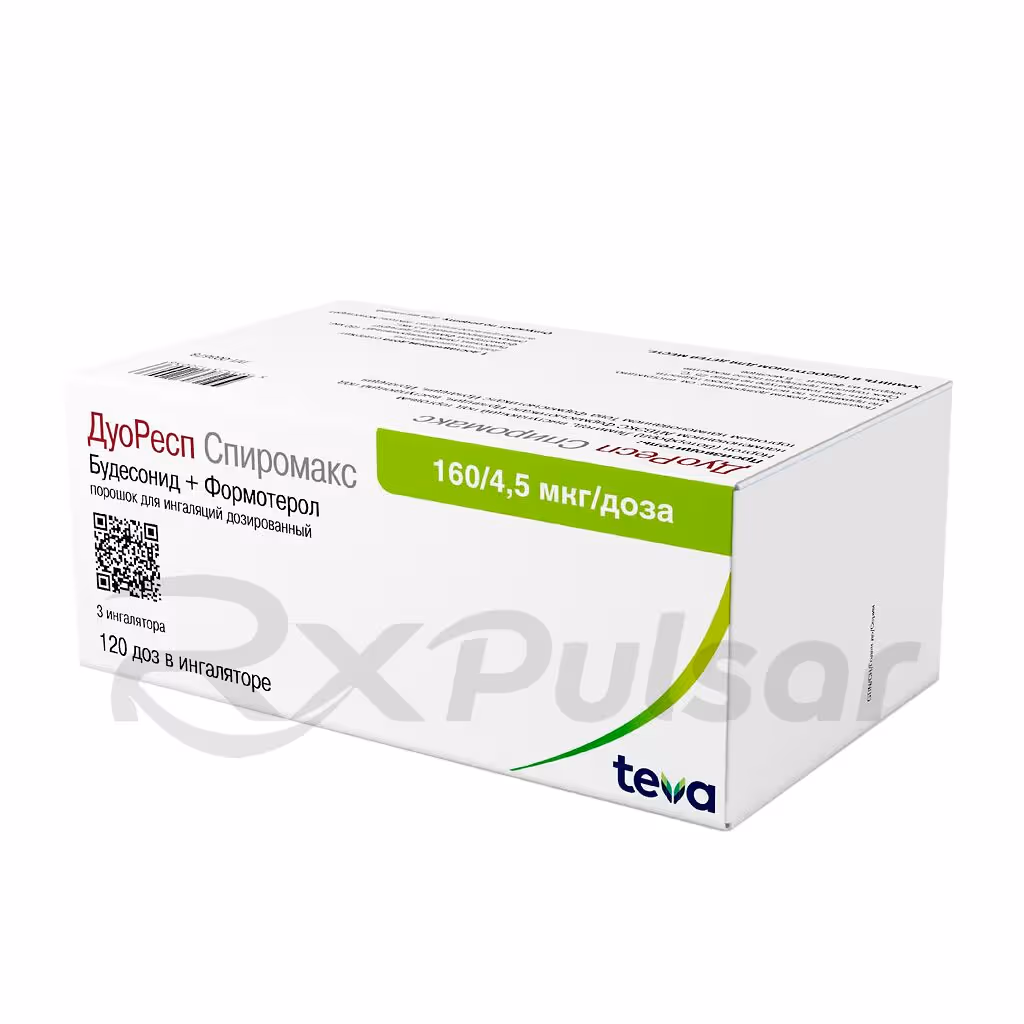 DUORESP SPIROMAX is a combination inhaler containing two active ingredients: budesonide and formoterol. Budesonide is a corticosteroid, reducing inflammation in the airways. Formoterol is a long-acting beta2-agonist (LABA), relaxing the muscles around the airways to improve airflow. This unique combination addresses both the inflammatory and constrictive aspects of respiratory diseases.