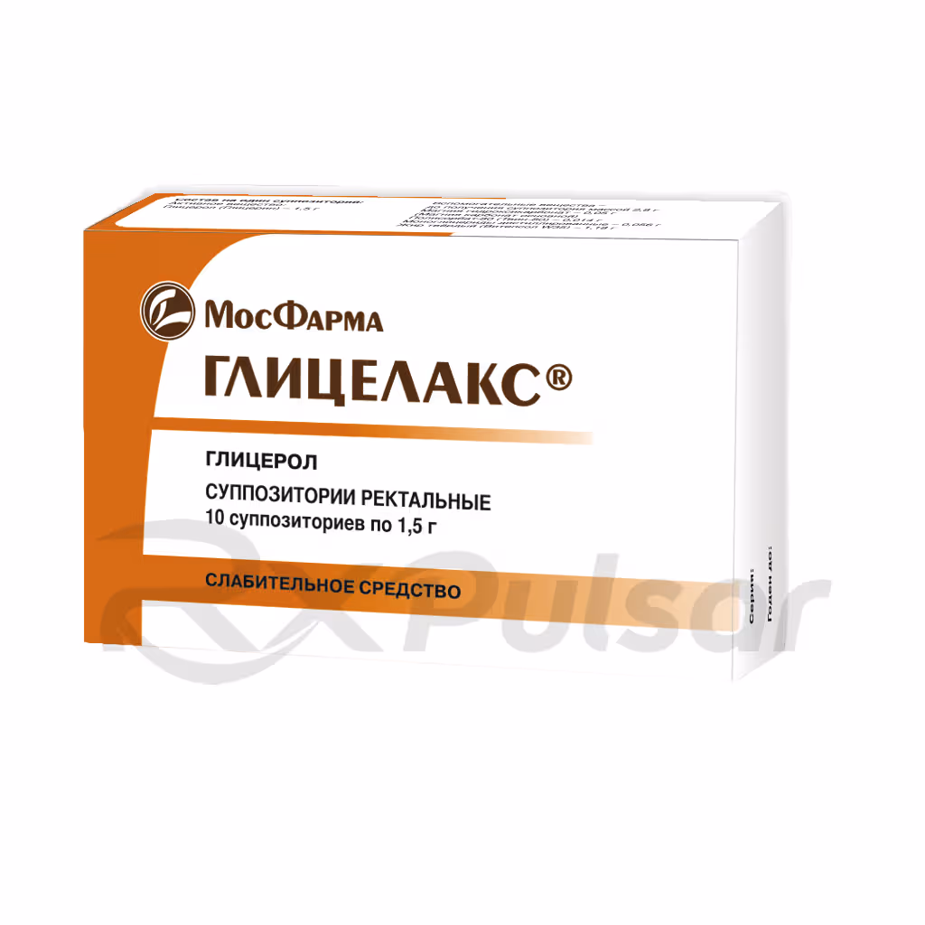 Glycelax rectal suppositories are a laxative medication used to treat constipation. Each suppository contains 1.5 grams of glycerin (glycerol), a naturally occurring substance that helps soften stool and stimulate bowel movements. The glycerin works by drawing water into the stool, making it easier to pass.