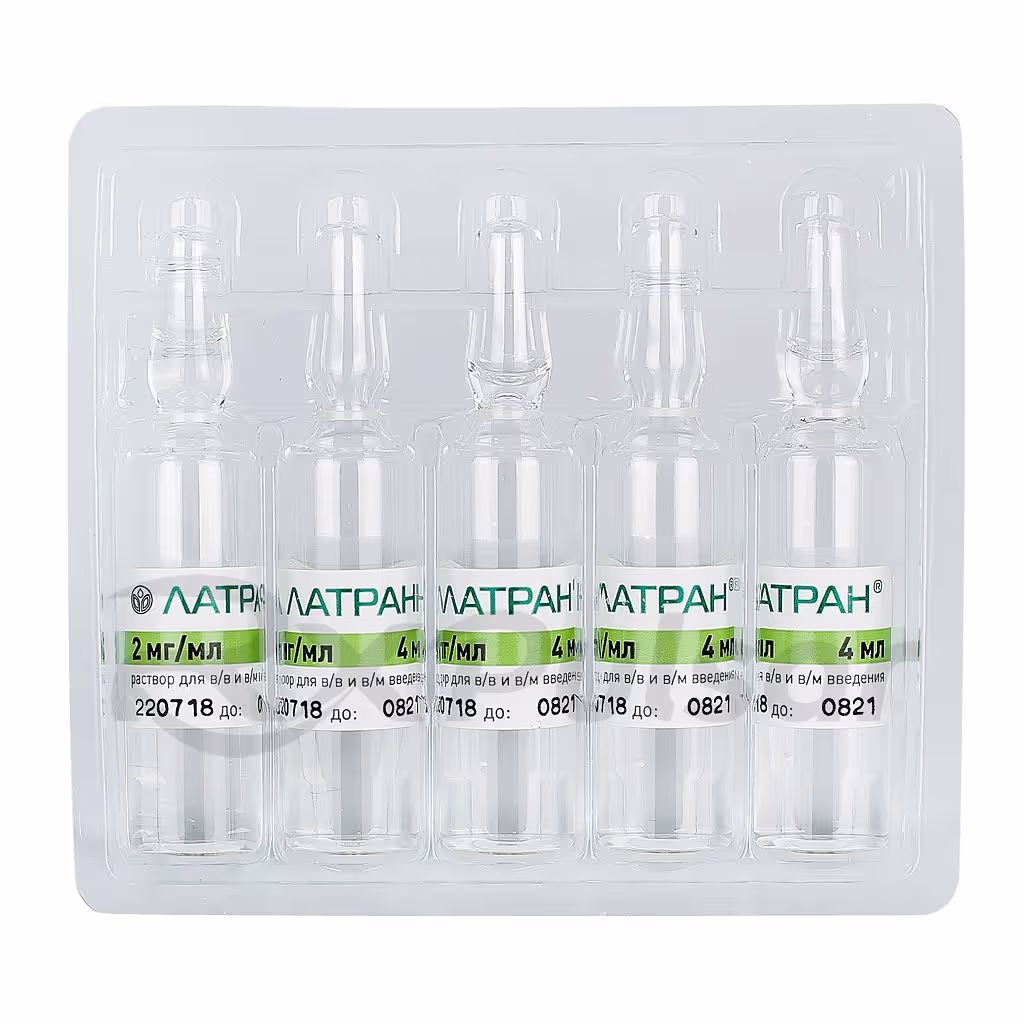 LATRAN is a pharmaceutical solution specifically formulated for both intravenous (IV) and intramuscular (IM) administration. Its precise composition remains undisclosed in this overview; however, the 2mg/ml concentration indicates a carefully calibrated dosage for effective therapeutic action. Further details regarding its active ingredients and complete formulation can be found in official product literature and medical databases.
