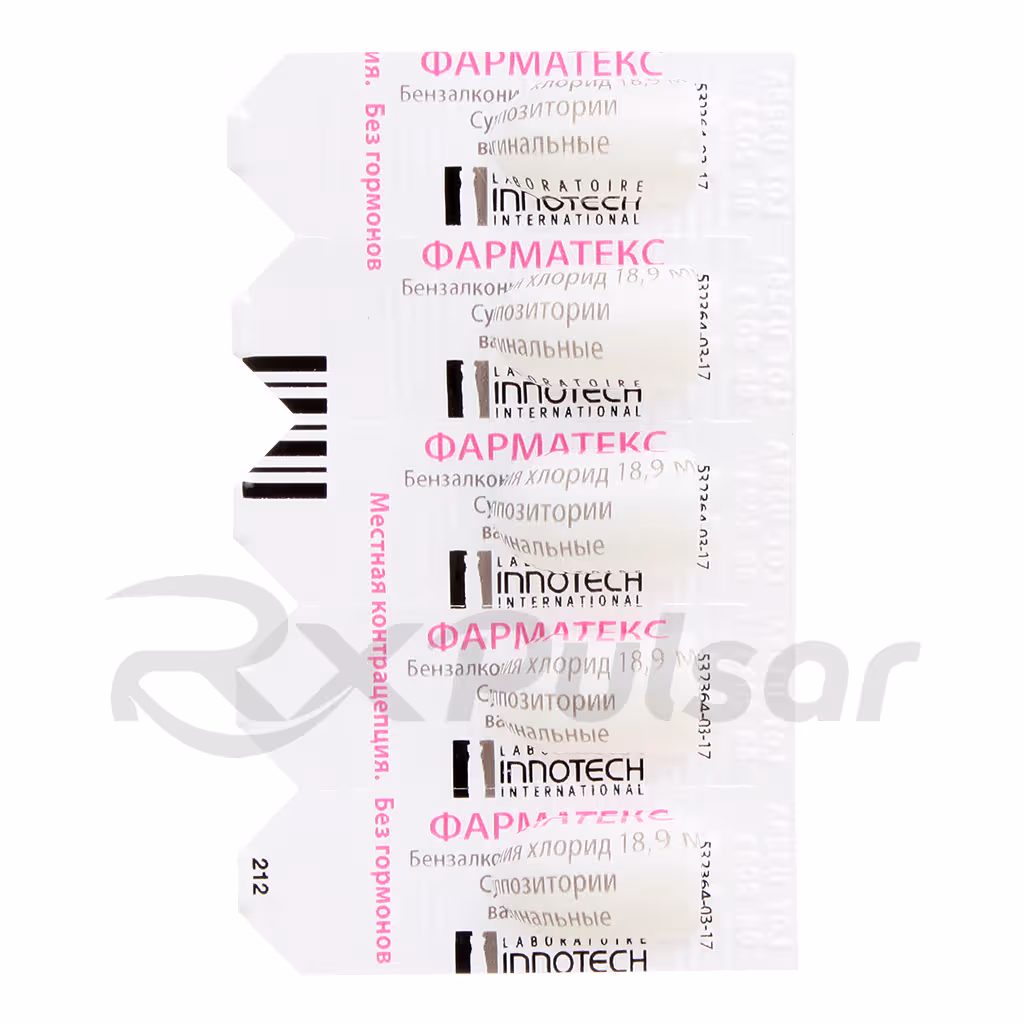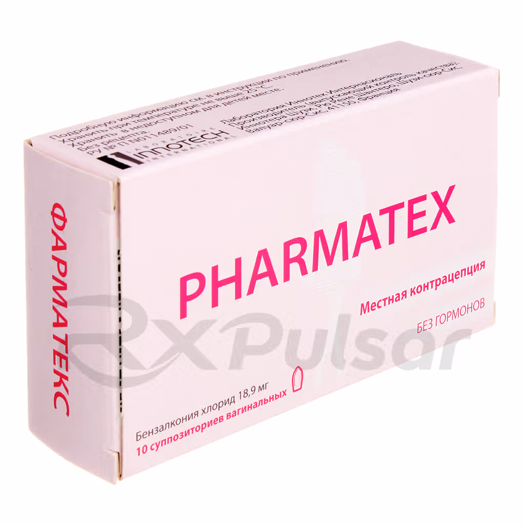 PHARMATEX vaginal suppositories contain a single active ingredient: benzalkonium chloride. Each suppository delivers 18.9 mg of this spermicidal agent, which is the key component responsible for its contraceptive action. Benzalkonium chloride is a quaternary ammonium compound, a type of cationic surfactant known for its antimicrobial and spermicidal properties. Its effectiveness stems from its ability to disrupt the cell membranes of sperm cells, leading to their inactivation and preventing fertilization.