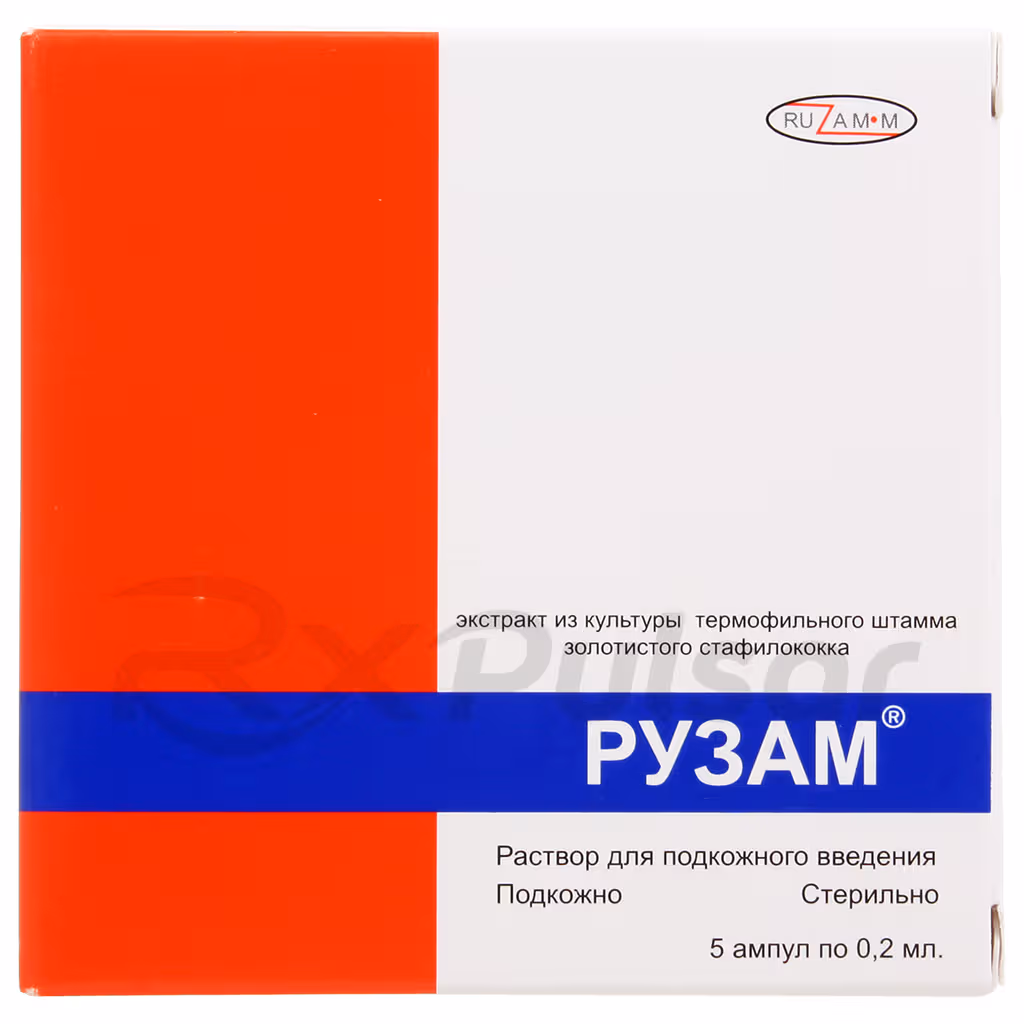 RUZAM is a sterile solution for subcutaneous injection, presented in ampoules containing a specific extract. This extract originates from a thermophilic strain of Staphylococcus aureus (strain C-2). The solution is designed to be administered under the skin, offering a targeted approach to immune modulation.