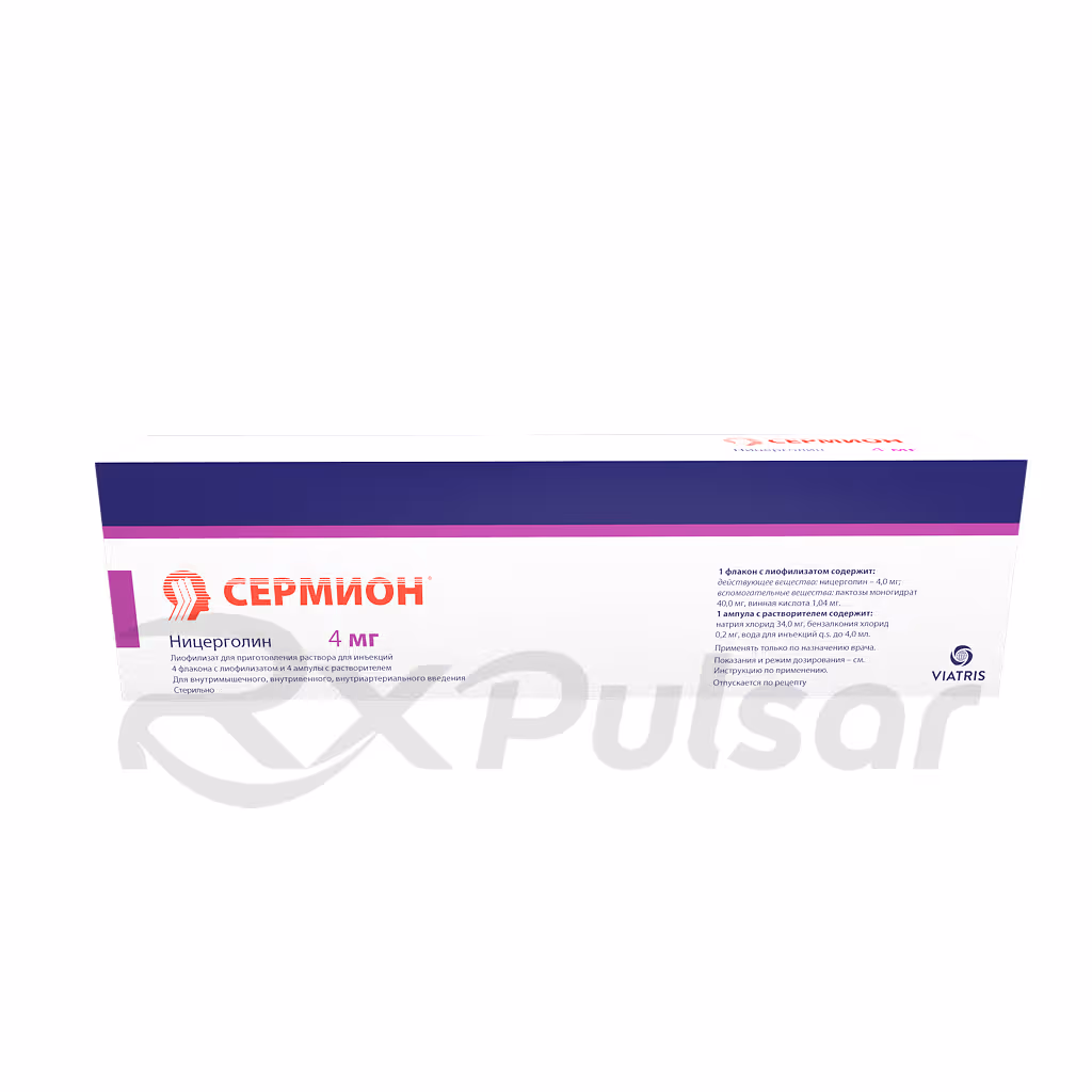 SERMION, containing the active ingredient nicergoline, is a medication primarily used to improve cerebral and peripheral blood circulation. It acts as an alpha-adrenergic blocker, influencing the tone of blood vessels and impacting blood flow dynamics. The lyophilized form allows for precise intravenous or intramuscular administration, offering a targeted approach to managing circulatory issues.