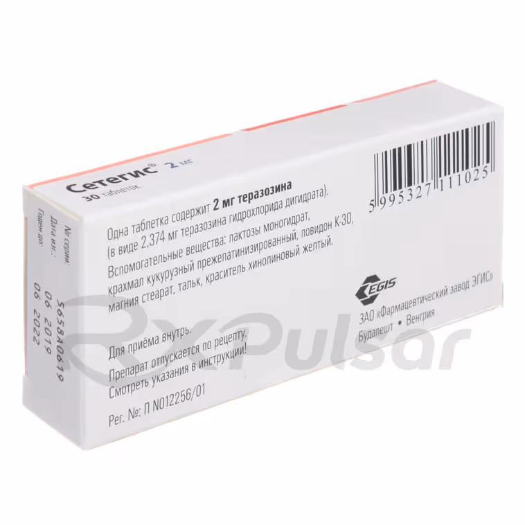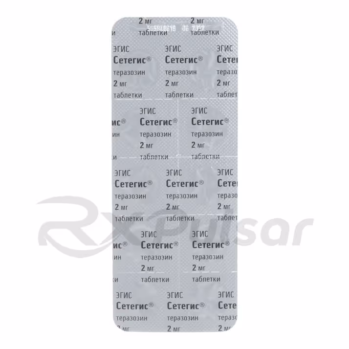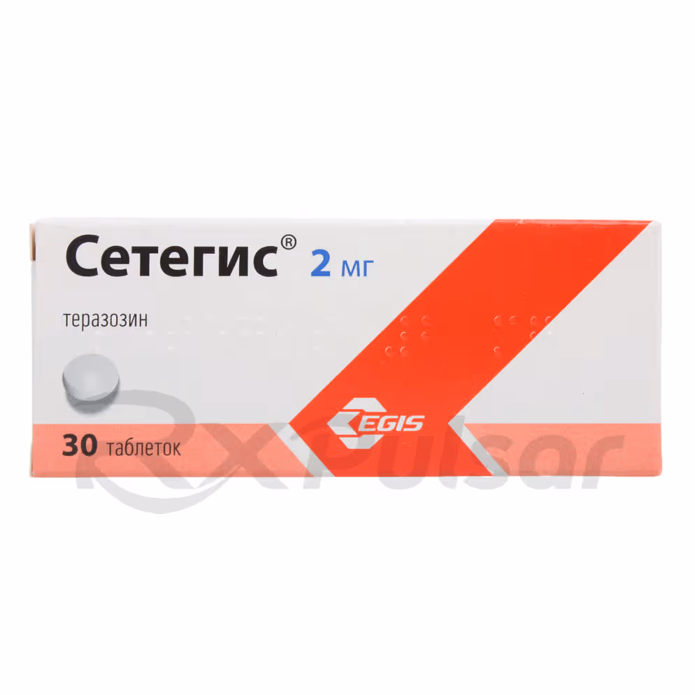 Setegis, containing the active ingredient terazosin, is a medication primarily used to treat benign prostatic hyperplasia (BPH) and hypertension. It works by relaxing muscles in the prostate and blood vessels, improving urinary flow and lowering blood pressure.