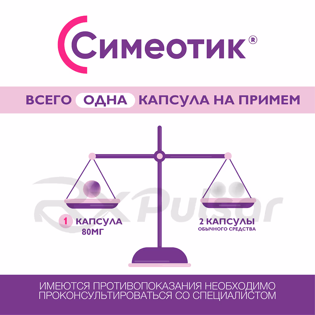 The key component of Simeotic is simethicone, a non-absorbable silicone polymer. This means it passes through the digestive system without being absorbed into the bloodstream. The 80mg dosage is presented in capsule form for convenient and easy administration. The capsule itself is designed for easy swallowing and optimal release of the active ingredient.