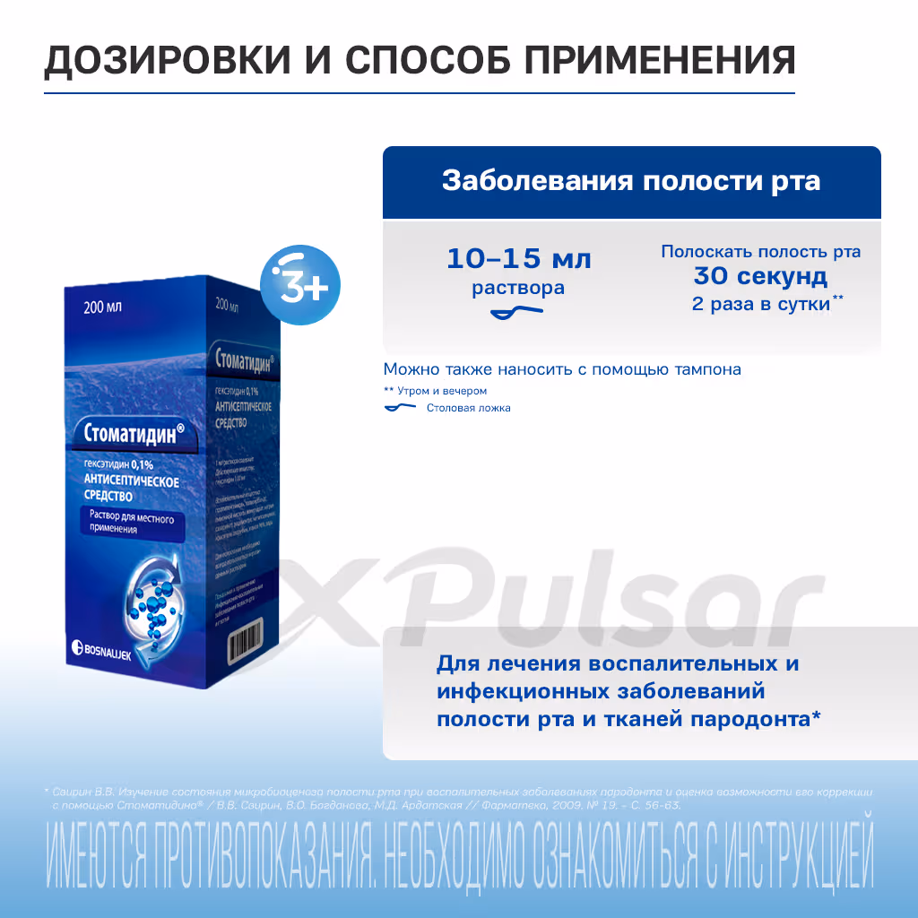 Stomatidin is a topical antiseptic solution primarily used in dentistry and otorhinolaryngology (ENT). Its effectiveness stems from its ability to combat infections and reduce inflammation in the affected areas.