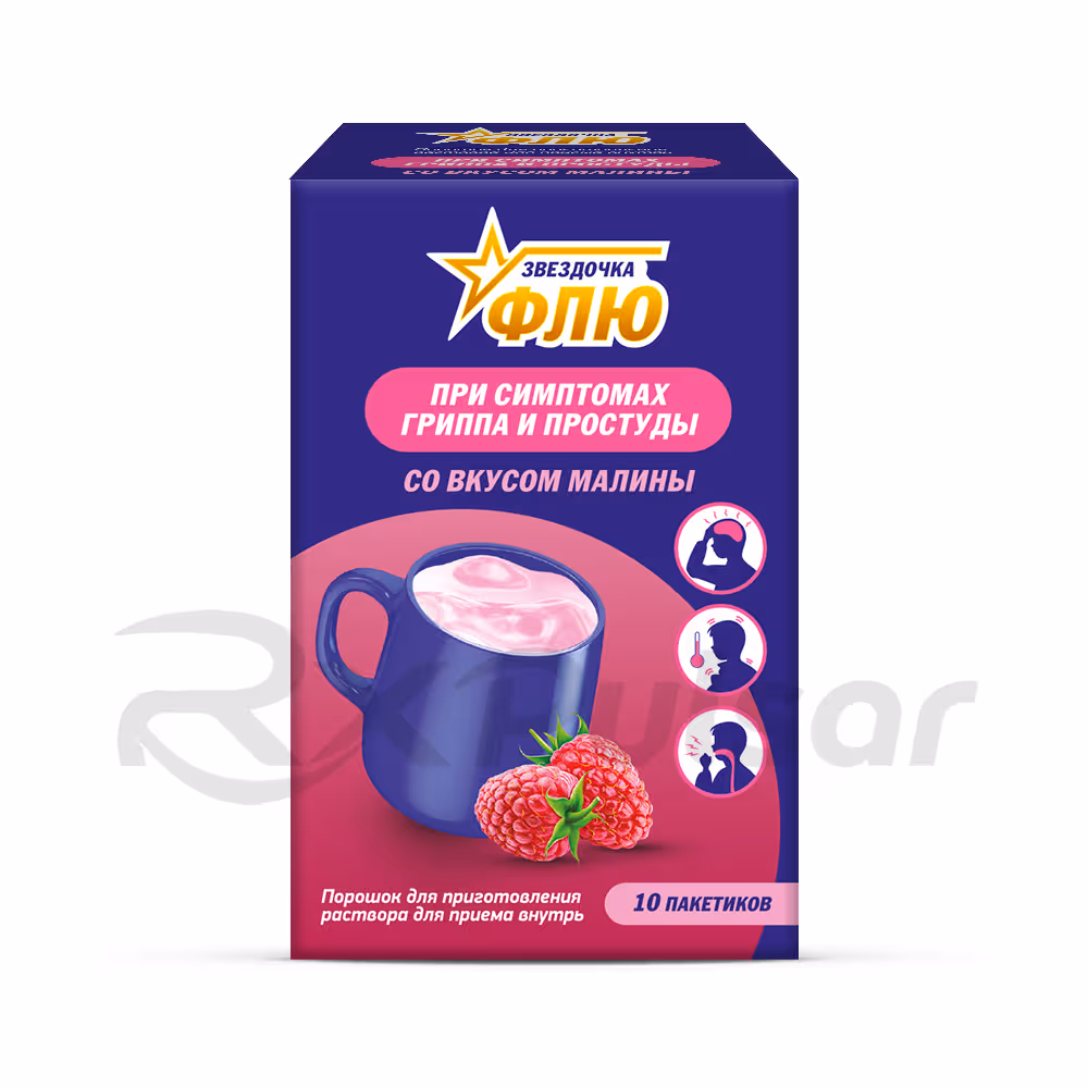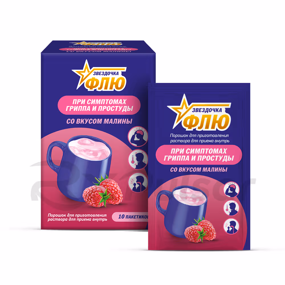 ZVEZDOCHKA FLU is a powdered formulation designed to be dissolved in hot water to create a soothing, warm beverage. It aims to provide symptomatic relief from various flu and cold symptoms, making it a convenient option for home treatment.