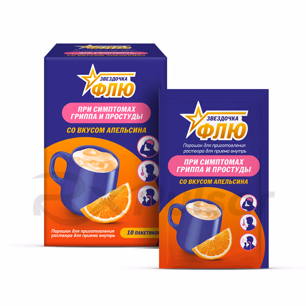 ZVEZDOCHKA FLU is a symptomatic treatment for common cold and flu symptoms. It aims to alleviate discomfort rather than cure the underlying illness. The powder is designed to be dissolved in hot water, creating a soothing drink.